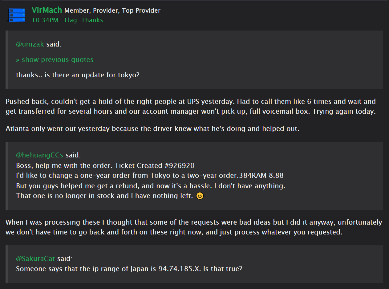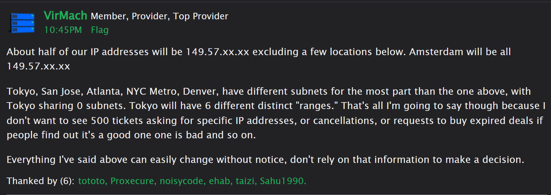 Tokyo, San Jose, Atlanta, NYC Metro, Denver, have different subnets for the most part than the one above, with Tokyo sharing 0 subnets. Tokyo will have 6 different distinct "ranges." That's all I'm going to say though because I don't want to see 500 tickets asking for specific IP addresses, or cancellations, or requests to buy expired deals if people find out it's a good one one is bad and so on.